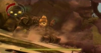 In the first segment of the battle, the creature used his enormous arm to squash the Prince, but in doing so it revealed his weak spot: a pair of big flowers on his hand. Aiming at those points granted the Prince to stun the creature and climb on the walls near it to jump and cut its head which was a sculpted mask.