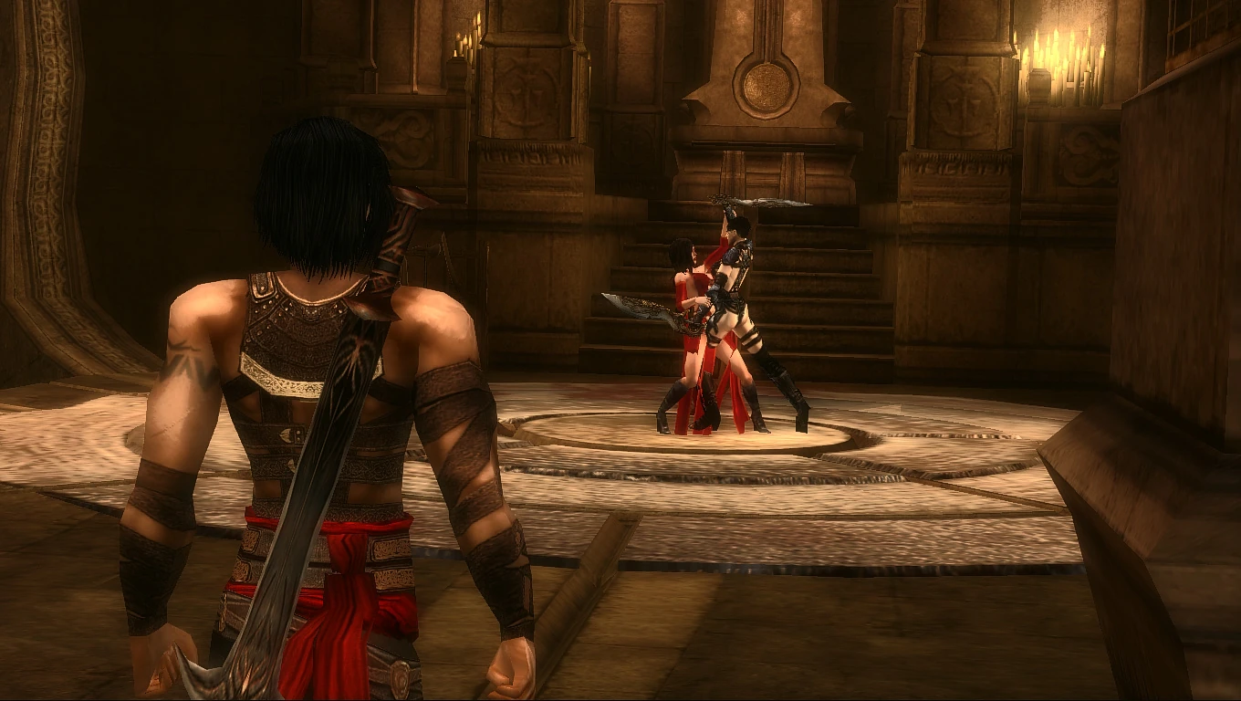 When the Prince first arrives at the Sacrificial Altar, he notices a strange wraith-like creature on a balcony above. He then hears commotion ahead and charges up the stairs to see Shahdee tussling with a mysterious woman. When the woman cries out for help, Shahdee throws her off the edge. The Prince and Shahdee begin their final battle here.